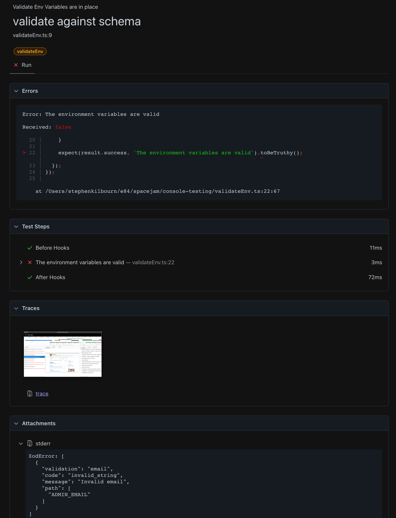 Enter Zod for making the tests easier to debug. Zod is a “TypeScript-first schema declaration and validation library” that is gaining popularity in the Typescript world. We can leverage it in an initial Playwright test before running our setup login tests.